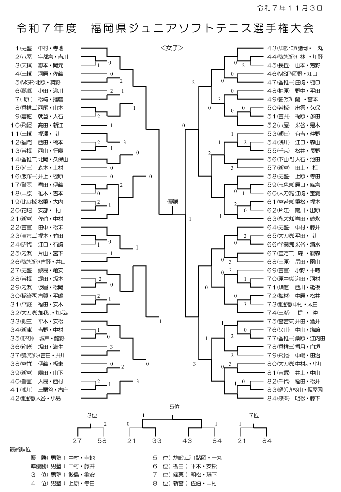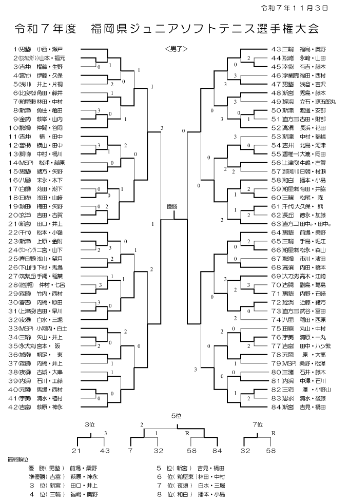 2025年11月11日 / 最終更新日 : 2025年11月11日 fukuoka-sta 2025年度 大会結果 令和7年度福岡県ジュニアソフトテニス選手権大会の結果 2025年11月3日(祝・月)に令和7年度福岡県ジュニアソフトテニス選手権大会が福岡市営今津運動公園庭球場で行われました。 男子個人戦結果[PDF] 女子個人戦結果[PDF]